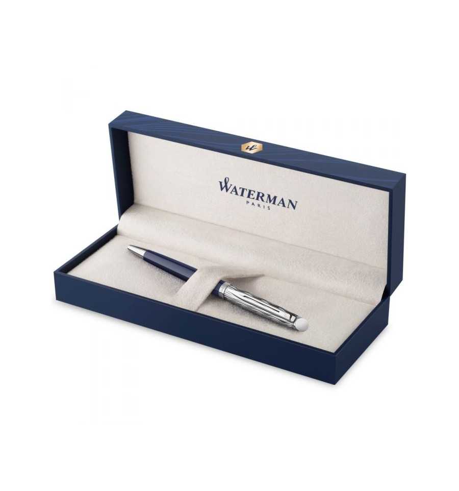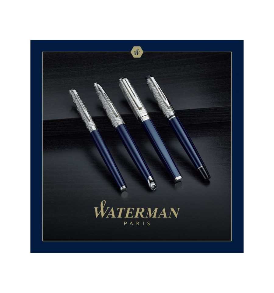 Conveying  Parisian  self-assurance, tailored to your signature style. PRODUCT FEATURES: • Designed and manufactured in France. • Elegant, refined and slim shape. • Vibrant deep blue lacquer. • Palladium plated cap with chiselled signature wave pattern • Stainless steel fountain pen nib with looped W Waterman design. • Waterman double-branched clip. • Presented in a prestige gift box.