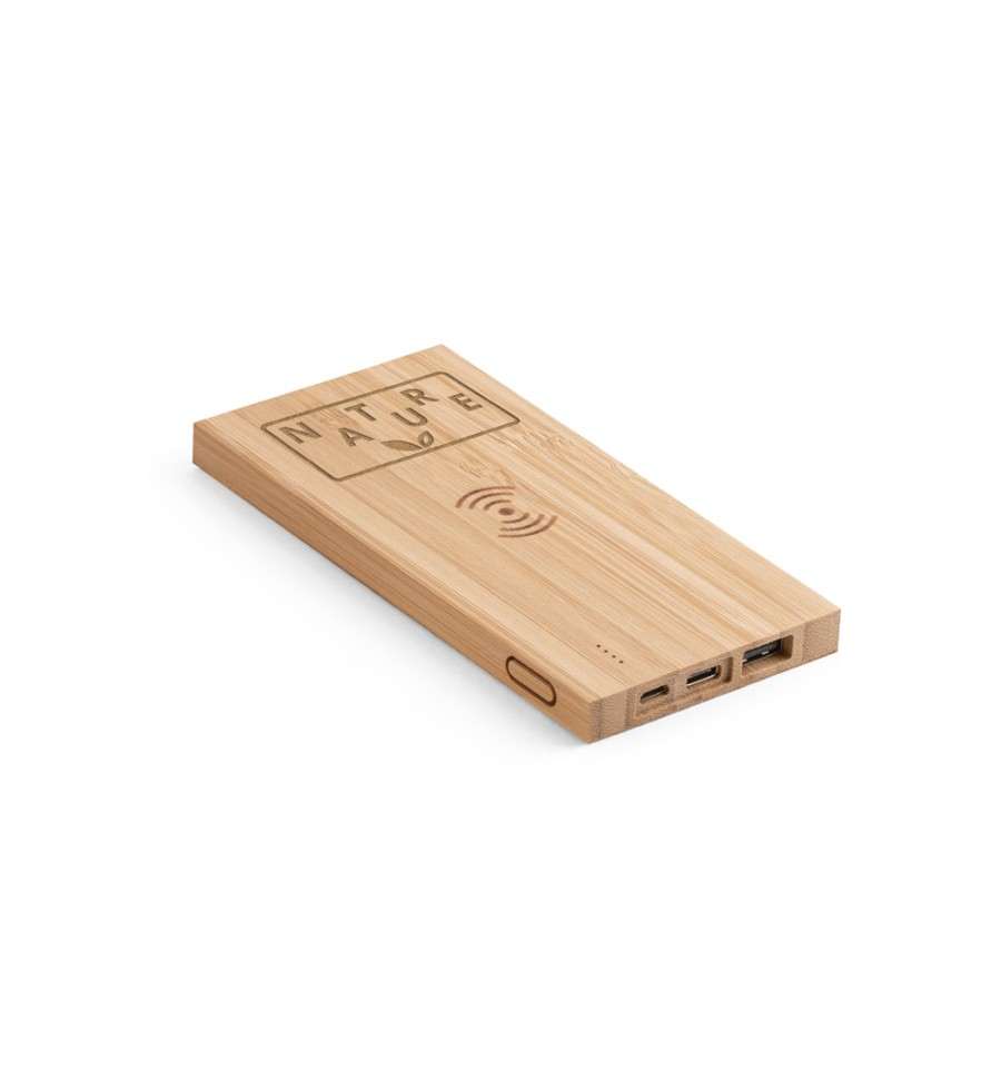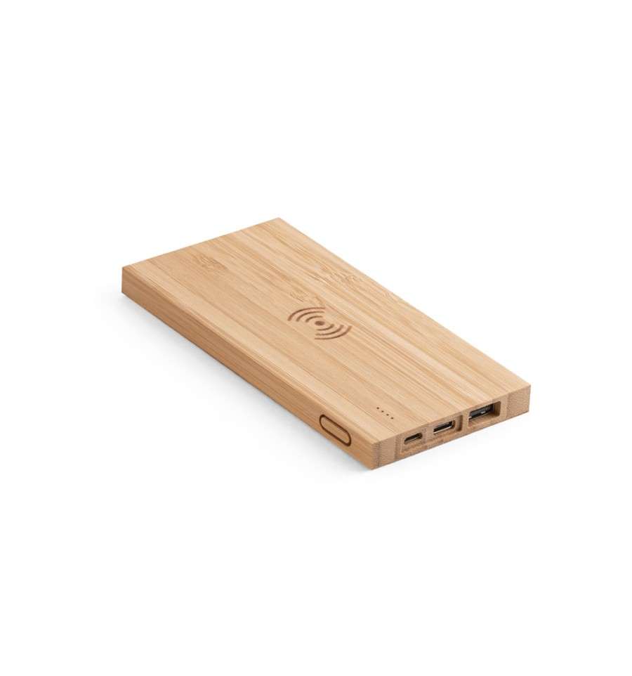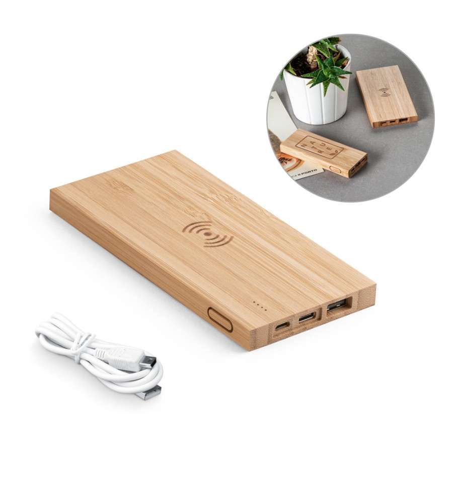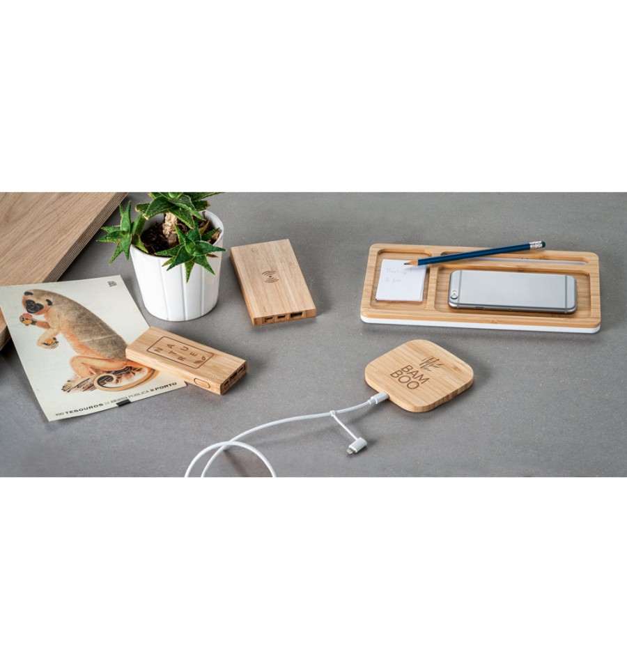Φορητή μπαταρία μπαμπού με ασύρματο φορτιστή. Μπαταρία λιθίου χωρητικότητας 5.000 mAh και διάρκεια ζωής ≥ 500 κύκλοι. Περιέχει είσοδο/έξοδο 5V/2A, ένδειξη φόρτισης, 1 θύρα micro USB, 1 θύρα USB τύπου C και 1 θύρα USB. Μέγιστη ισχύς ασύρματης εξόδου 5W. καλώδιο USB-C για φόρτιση. Συμβατό με smartphone με ασύρματη τεχνολογία φόρτισης. Παρέχεται σε κουτί δώρου από χαρτί κραφτ. Καθώς το προϊόν είναι κατασκευασμένο από φυσικά υλικά, το χρώμα του προϊόντος καθώς και το αποτέλεσμα της εκτύπωσης ενδέχεται να διαφέρουν από προϊόν σε προϊόν. 145 x 75 x 15 mm