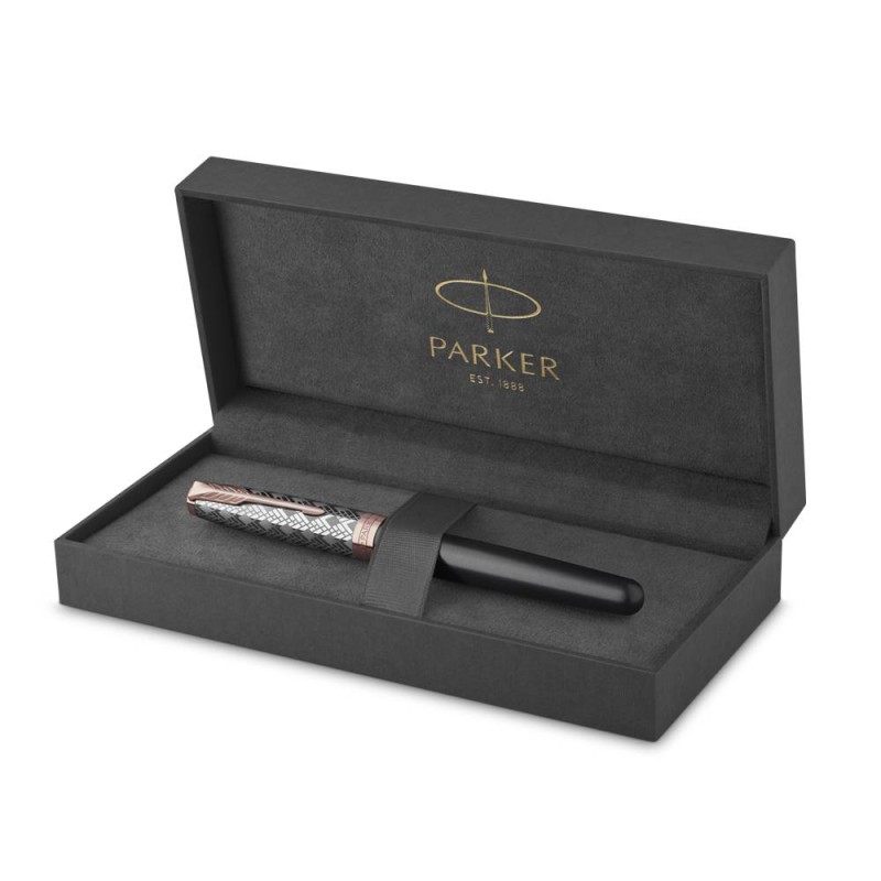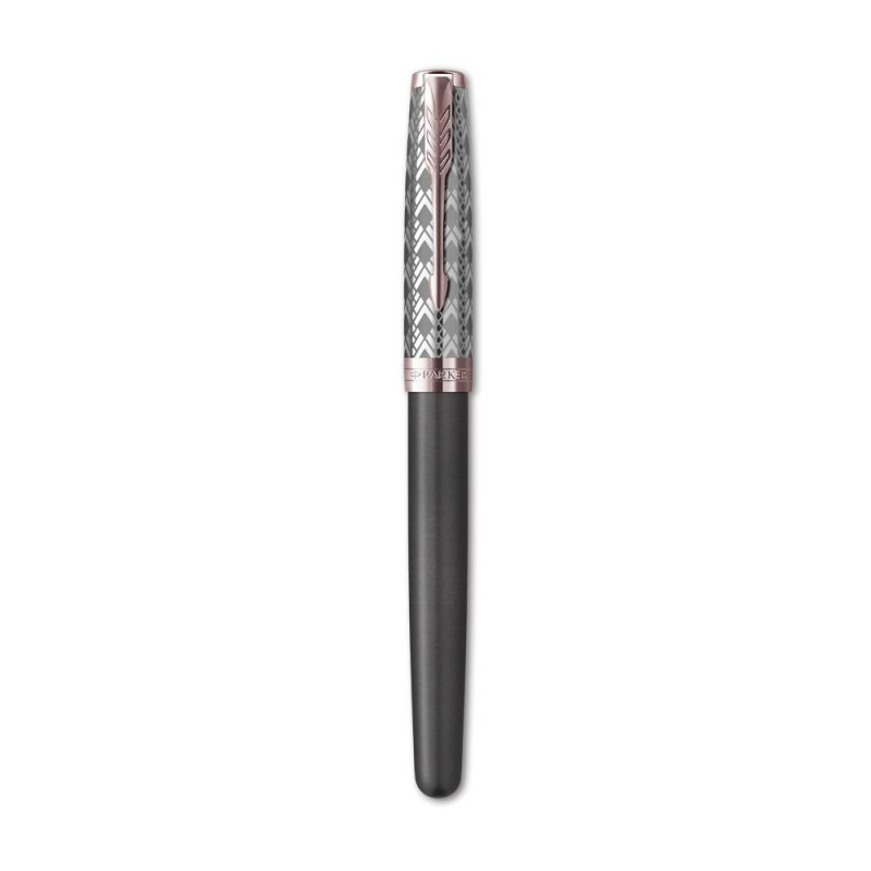 Ο στυλογράφος  Sonnet Metal Grey  αποτελεί την  κλασική έκφραση εκλεπτυσμένου στιλ και κομψότητας. O κορμός του είναι επεξεργασμένος με γκρι σατέν φινίρισμα, με διακοσμητικά στοιχεία από ροζ χρυσό και συμπληρώνεται με πένα από μασίφ χρυσό 18k με φινίρισμα ροδίου. Το ασημένιο καπάκι του παρουσιάζει ένα  εξαιρετικό χαραγμένο μοτίβο.