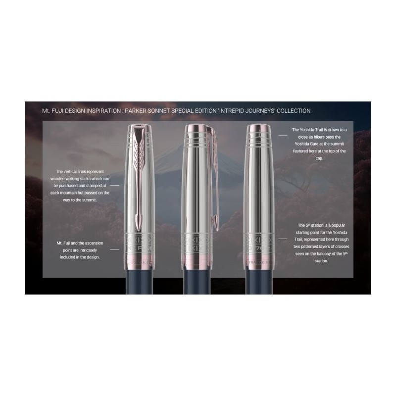H έκδοση Sonnet Mt. Fuji εμπνέεται από την ομορφιά και το μεγαλείο του εμβληματικού βουνού της Ιαπωνίας και αποτελεί τη πρώτη έκδοση από μία σειρά που αντλεί έμπνευση από εμβληματικές τοποθεσίες σε ολόκληρο τον πλανήτη. Χαρακτηριστικά: Καπάκι:      Μασίφ ασήμι 925 ° με επικάλυψη παλλαδίου και εγχάρακτη διακόσμηση εμπνευσμένη  από το όρος Φούτζι Κορμός:    Ορείχαλκος με στρώματα μπλε λάκας Shell:    Από ορείχαλκο με φινίρισμα από ανοξείδωτο χάλυβα Μύτη:   Μασίφ χρυσό 18k με επικάλυψή ροδίου Διακοσμητικά Στοιχεία:    Ροζ χρυσό